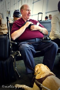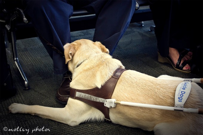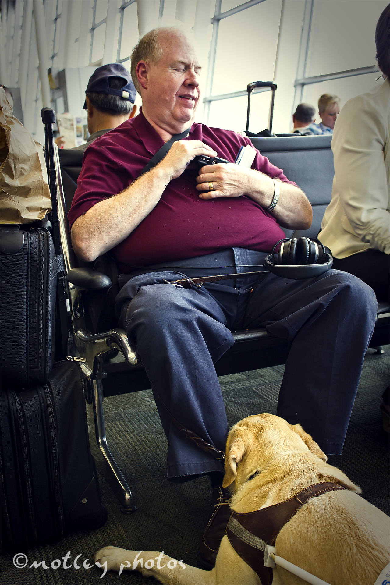 This past week, I had traveled to Indianapolis on business. While at the airport awaiting my flight to return home, a blind gentleman and his guide dog – a beautiful blond Labrador Retriever – sat opposite of me in our boarding gate seating area. Naturally, I asked the stranger what the dog’s name was and he responded his name was Freddie (or Freddy, not sure of the spelling). At least that is what I thought he said. I have since found out that the dog’s name is “Africa.” Of course, being the photography lover that I am, out pops my camera to take a few photos of Freddie. By this time, however, he had turned his head so that he was facing his human partner’s feet so I was unable to get a proper face shot.