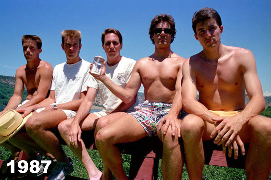 The now college-educated men once again returned during the summer of 1987. During this retreat, they all decided to line up in the same fashion as they did for their vacation photo in 1982. The jar and hat were different, but still present, as were the rather dark and mysterious looks on their faces.