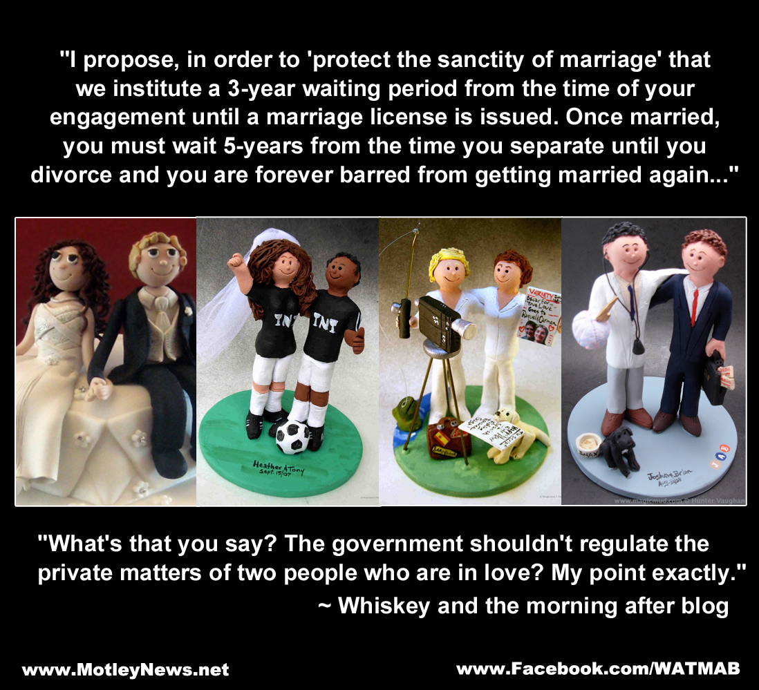 “What’s that you say? The government shouldn’t regulate the private matters of two people who are in love? My point exactly.” Signed, Whiskey and the morning after blog