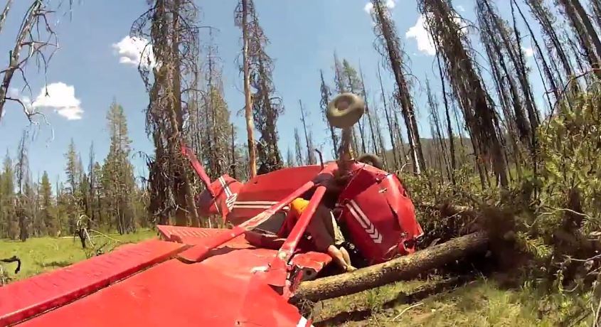 First of all, everyone survived this crash, which was a vintage 1947 Stinson and occurred in the mountains in Idaho in June (2012). Tol Gropp has the camera in the cockpit. He, two of his friends, and his father – who was the pilot – were flying into the Idaho mountains for a morning hike in the Frank Church River of No Return Wilderness and were planning to fly on to another site for dinner.