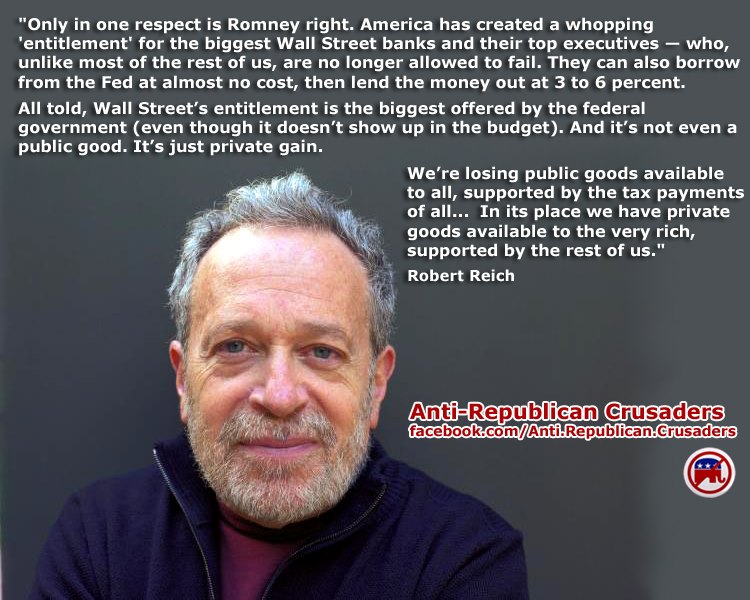 “Only in one respect is Romney right. America has created a whopping entitlement for the biggest Wall Street banks and their top executives — who, unlike most of the rest of us, are no longer allowed to fail. They can also borrow from the Fed at almost no cost, then lend the money out at 3 to 6 percent.