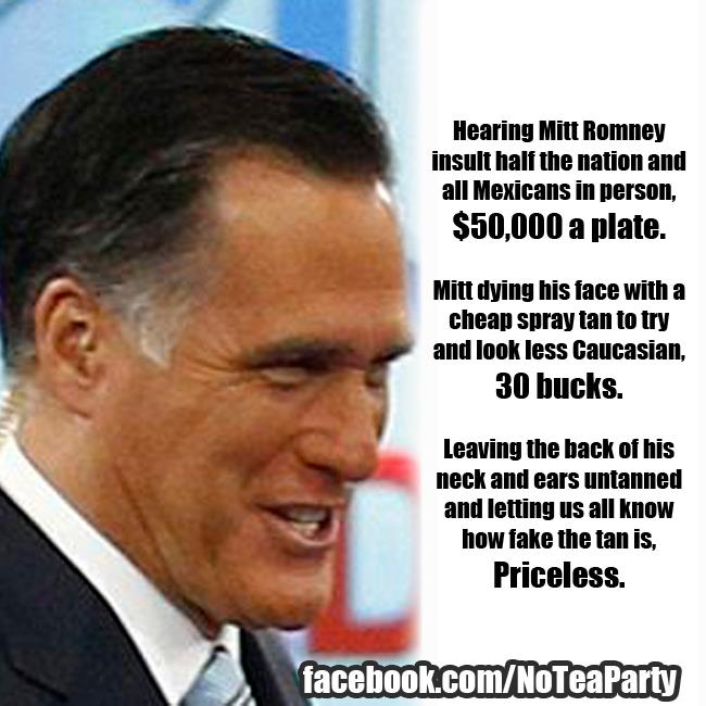 2. I heard one commentator say that if Romney’s skin got any darker, he wouldn’t vote for himself. A spray tan?? Really, what a naked attempt to pander to Latino audiences.
