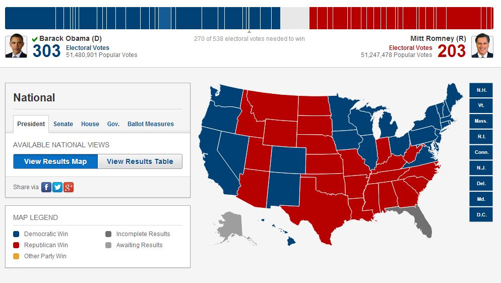 All I want to say is thank goodness. It’s over. I don’t have to move to Canada now. Obama over Romney via Electoral College. Obama ahead in popular vote… but just barely. Numbers not yet final. All the news sites, major and independents, are all posting the results, so I’m not going to here. They’re not final anyway.