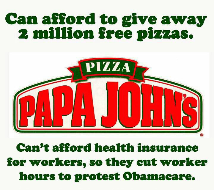 In using Schnatter’s estimate that healthcare reform would cost his company $5 to 8 million more annually, Forbes magazine said providing healthcare translated into a 0.4 percent to 0.7 percent increase in the price of a pizza. Steve Colbert, and Schnatter himself, claim (OMG, are you ready for this? Please sit down if you’re standing)… they claim about a 14 cent increase in price will pay for the additional cost of ObamaCare! Well, slap some garlic and hot peppers on that and raise your pizza a whole quarter if you want. I have nary a clue as to what the price is now anyway. And the price does vary depending upon location. I don’t think they’ll lose on whit of business with a 25 cent increase for a pie. In fact, I may even come in and just pay for a pizza but not order one since I don’t care for their pizza. If that helps a student, or a young parent, or a divorcee get some health care coverage, I have no problem with that. Actually, I should order the pizza and give it to some of our homeless folk here.