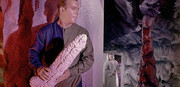 A behind-the-scenes photo of Captain Kirk holding a rather phallic stalactite.