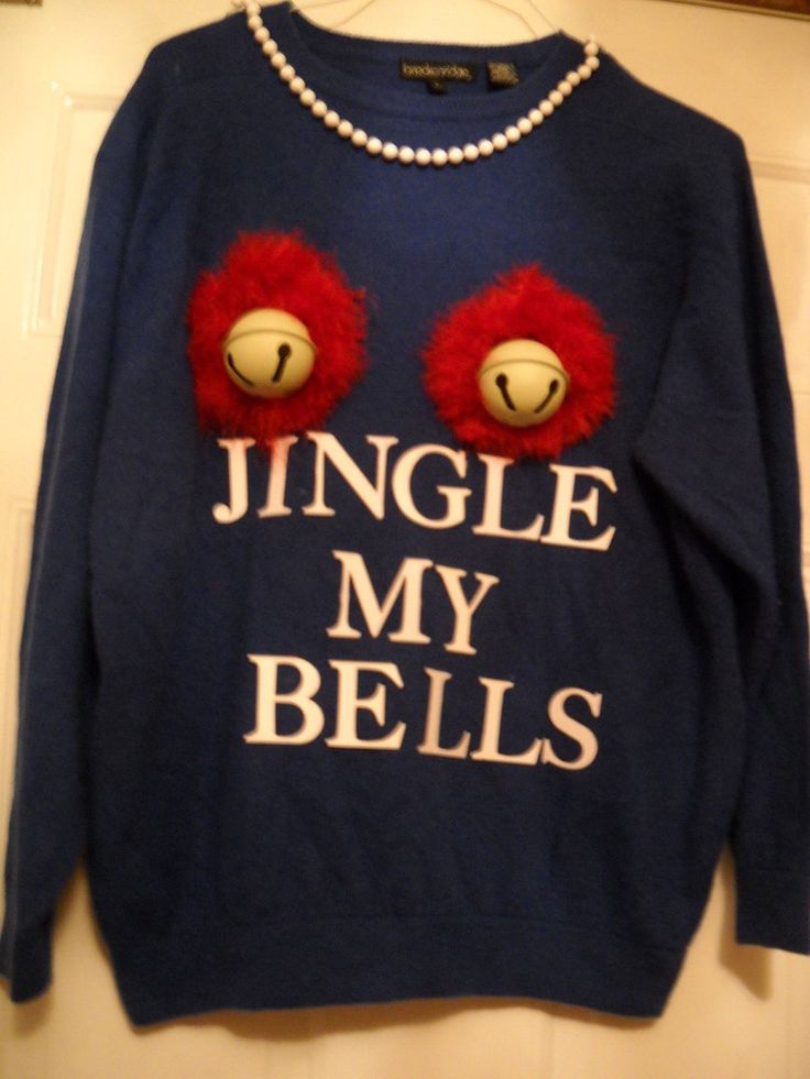 Jingles bells placed over breasts on an ugly Christmas sweater.