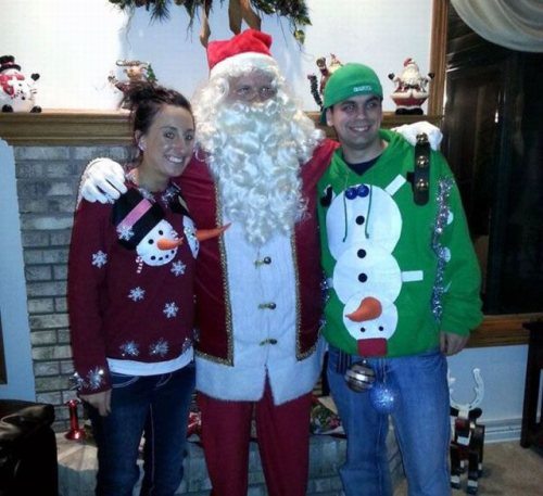 More ugly Christmas sweaters with snowman and their carrots protruding as either a penis or breasts.