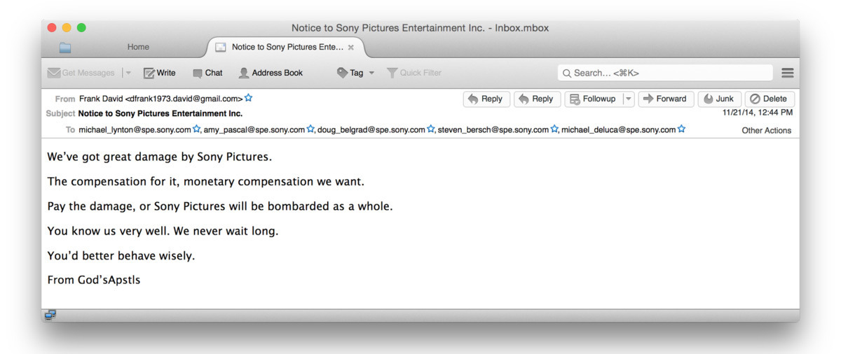 We already warned you [meaning the email sent to Pascal but never opened], and this is just a beginning. We continue till our request be met. We’ve obtained all of your internal data including your secrets and top secrets. If you don’t obey us, we’ll release the data shown below to the world.