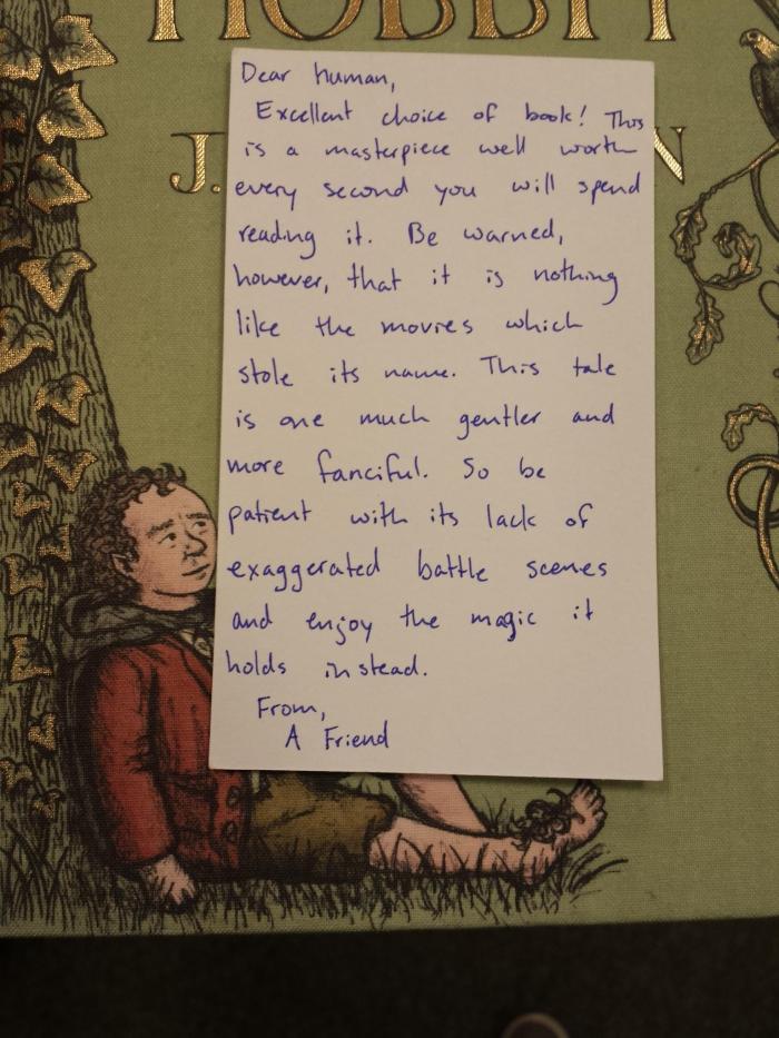 This note says it all. Reddit user, bigbruck, purchased a new copy of The Hobbit and inside of the book was this note….