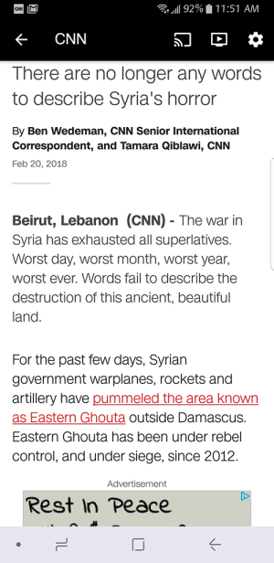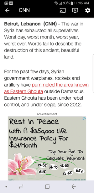 Yeah, this is bad. I was reading this article in the CNN app about the current news in Syria. When scrolling down, an advertisement came into view. This is what I first saw when scrolling down: