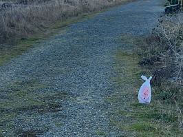 I thought–it’s frightened so it’s staying still, take it slow. I walked up to it little by little, carefully, not to frighten it. Friends, I just spent a very slow ten minutes walking up to a plastic bag of dog poop.