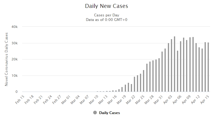 On the more positive note, the US curve is starting to flatten out. We seemed to have peaked for new cases. This chart includes April 15. Click here to see the page with US-only numbers.