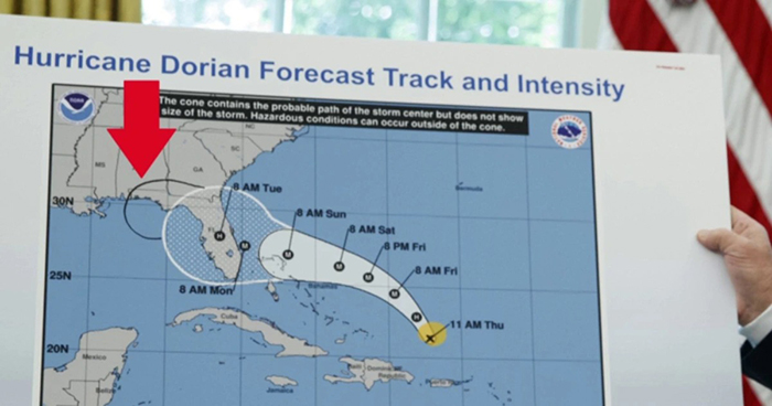 Of course, Trump did not like being corrected at all. In his world, he is NEVER wrong. Later in the day, Trump showed a map of the hurricane’s path and there, to the left of the path, is a black Sharpie line that includes Alabama in Hurricane Dorian’s path.